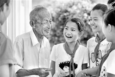 黄文谦老人(左二)在仙游度尾中峰小学向小朋友了解学习近况(6月17日摄)。