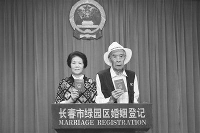 2015年7月2日,吉林省长春市,当日10时50分许,长春市绿园区民政局婚姻登记处发出了两张结婚证,男女双方从走进大厅到领完证离开,全程受到注目。手持红本本的是两位步履蹒跚的老人,男方孙德敏78岁,初婚,女方潘素珍62岁,丧偶。两人走到今天,按时下的流行说法,还算“闪婚”。孙立国/CFP