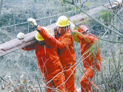 2014年3月11日,彭大权(中)在南江县柳湾乡麻柳村一社、二社无电地区施工现场。(张晓勇/摄)