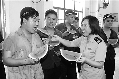 针对近期高温天气持续增多的实际情况,连日来南昌铁路局各级工会组织不断加大“送清凉”力度,采取多种“凉策”,全力确保职工平安度夏。图为7月2日,福州车辆段工会把西瓜送到了作业现场。