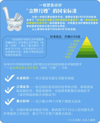 本报讯(记者杨召奎)如今,越来越多的产妇在坐月子时,都会请月嫂帮忙带孩子。然而,月嫂市场的服务质量良莠不齐,如何挑选一个适合自己家庭的月嫂,并不是一件容易的事。为进一步规范家政服务市场,国家标准委7月5日批准发布《家政服务母婴生活护理服务质量规范》和《家政服务机构等级划分及评定》两项国家标准,对母婴生活护理服务质量和家政服务机构划分进行了规范与界定。这两项标准将于2016年2月1日起实施。