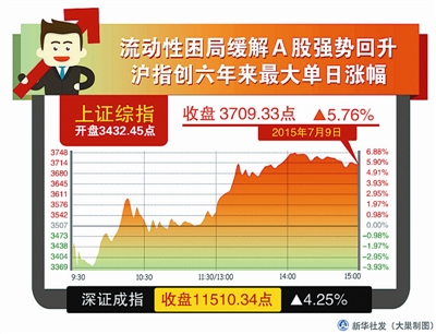 本报北京7月9日电(记者北梦原)受多部门政策利好影响,今天两市全线上涨,上证综指上涨5.76%,报3709.33点;深证成指上涨4.25%,报11510.4;创业板上涨3.03%。两市共有1273只个股涨停,创业板可交易股票全部涨停。