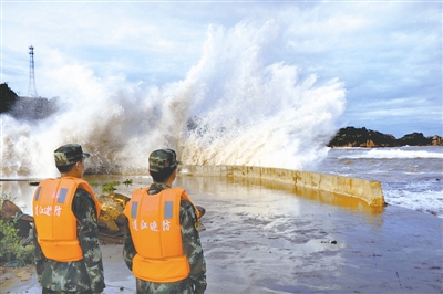 7月10日,福建省连江县边防官兵在苔菉镇琇垹村海域观察台风动向。
