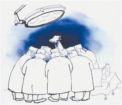 手术台前,医生、护士各司其职,开刀顺利即将功成。咦,怎么还有一位厨师站在其间?是食疗?还是为同事供餐?