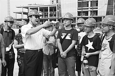 7月7日至11日,长沙“火炉”开始发威。来自中南大学土木系的24名大学生,在北京城建集团承建的长沙梅溪湖国际文化艺术中心工地进班组当工人,学施组方案、学焊接、学测量、跟着吊装工人体验钢构件吊装施工等,进行了1周的实践教学活动。