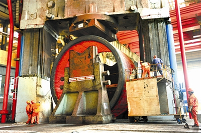 中信重工机械股份有限公司研制的大型加氢筒体锻件,近日在18500吨油压机上成功锻造。该锻件外径6.72米,高3.95米,单重达202.61吨,采用338吨特种钢锭生产,是目前国内最大的加氢筒体锻件。该锻件的成功锻制,标志着中信重工已成为国内少数能提供制造大型加氢锻件的公司之一。图为锻造完成的筒体。(雷正道 摄)