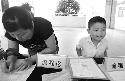7月13日,在合肥市临湖小学报名点,来自湖南省江永县的陈鑫宏小朋友在家人的陪伴下报名入学。据悉,合肥市2015年把132所中小学确定为接收进城务工人员随迁子女的定点学校。进城务工人员随迁子女,只要提供相关证件办理报名登记手续,可和城区学生享受同等入学待遇。新华社记者 刘军喜 摄