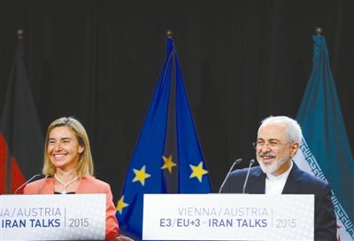 7月14日,在奥地利维也纳,欧盟外交和安全政策高级代表莫盖里尼和伊朗外长扎里夫在新闻发布会上宣读共同声明。 新华社发