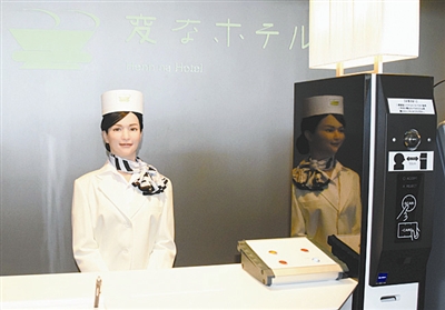 当地时间2015年7月15日,日本佐世保,一家名为Henn-na(海茵娜)的机器人酒店计划于17日开业,该酒店由机器人组成服务团队。精通多种语言的仿人机器人作为前台迎接顾客,其他机器人完成上餐以及清洁等工作。该酒店的房门是通过人脸识别技术开门的。