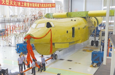 中航工业研制AG600是当今世界上在研的最大一款水陆两栖飞机,是为满足森林灭火和水上救援的迫切需要,属于国家应急救援体系建设急需的重大航空装备。总长达39.3米的机身正式对接完成,全面进入总装阶段,标志着项目研制取得了重要的阶段性成果,为2015年底前AG600飞机完成总装,2016年上半年实现首飞奠定了基础。 新华社记者 魏蒙 摄