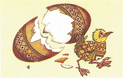 工艺彩蛋孵化出五色俱全的鸡雏,它靓丽的衣装十分抢眼。人们惊叹遗传基因新发现,也称赞漫画家睿智巧妙构思。