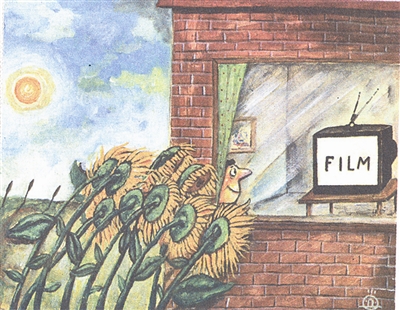 精彩影视节目引人入胜,这幅画妙在向日葵一齐转看荧屏。作者巧借植物逐光的特性,顺理成章地褒扬了艺术之魅力。【黑山】 达尔科