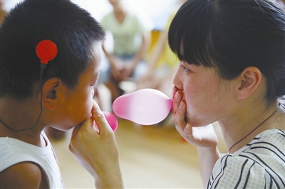 但2010年冬天,薛子程不幸患上双耳极重度感音性耳聋。夫妻俩选择了专业康复收费较低的安徽省第一家民办听障儿童康复中心——“笑童颜”语训康复中心。2013年7月,程海燕辞去工作,全职陪伴孩子做康复训练。她的责任心和能力得到“笑童颜”创始人周校长的关注。一年后,周校长在退休时,将接力棒交到了程海燕手上。图为7月15日,在合肥市“笑童颜”语训康复中心,32岁的程海燕在给听力残障的孩子们上康复课。