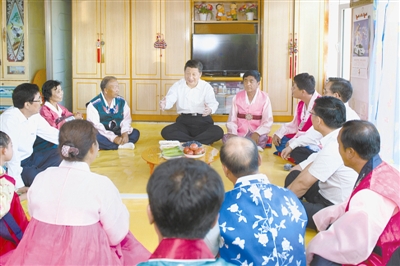 村委会对面有几户朝鲜族农家。习近平走进村民李龙植家里,了解一家人收入和生活情况。然后,他盘腿而坐,同村民们亲切交谈。大家争着向总书记述说这些年村子里发生的可喜变化,住上了新房子,用上了自来水,通上了有线电视和网络宽带,搞起了旅游,公共服务进了社区,生活环境干净整洁,晚上还有路灯,习近平听后很高兴。他表示,看到这里安定祥和,心里很踏实。检验农村工作成效的一个重要尺度,就是看农民的钱袋子鼓起来没有。要通过多种途径着力构建农民持续较快增收的长效机制。新农村建设要坚持规划先行,注重乡土味道和民族风情,注重补农村的短板、扬农村的长处,努力建设美丽乡村和农民幸福家园。从农家出来时,村民们纷纷向总书记问好,习近平同他们热情握手。村民们簇拥着总书记,直到把总书记送上车仍依依不舍。