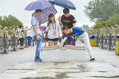 在卢沟桥上,几名劳模代表驻足观看。