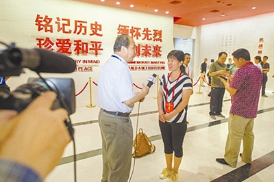 全国劳模梁会兰在参观抗日战争纪念馆时接受中央电视台采访。