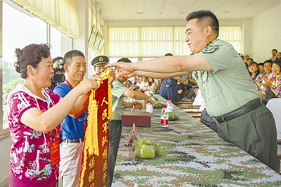 天津市全国五一劳动奖章获得者徐文华和辽宁省全国劳模赵明枝向解放军赠锦旗。