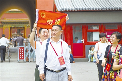 劳模旗帜在身后。陕西省劳模代表在故宫外的别样合影。