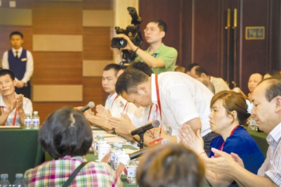 劳模座谈交流会上,河南省全国劳模黄久生说,自己是吃百家饭长大的,是乡亲们的关怀成就了今天的自己。发言后,他虔诚地向与会代表鞠了一躬。