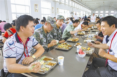 来自广西的劳模代表和军营战士们一起吃午饭。