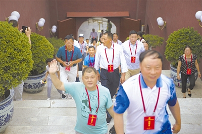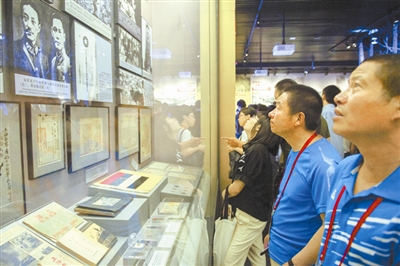 在抗日战争纪念馆,劳模代表们在国民革命军第十九路军总指挥蒋光鼐和军长蔡廷锴肖像前停下脚步。