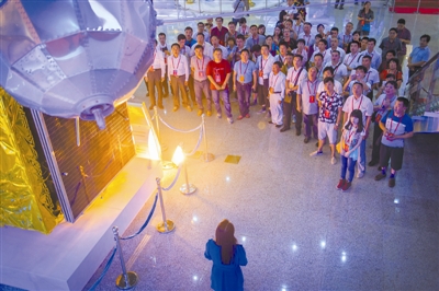 劳模代表们在航天城现场听工作人员讲解中国航天事业的发展历程,图为中国第一颗人造卫星“东方红一号”模型。