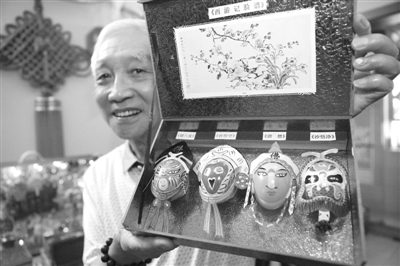 7月19日,上海,77岁的费永泉把鸡蛋壳变成艺术品,10余年创作出两千余幅脸谱画。 图为费永泉展示他创作的蛋壳画作品《西游记脸谱》。