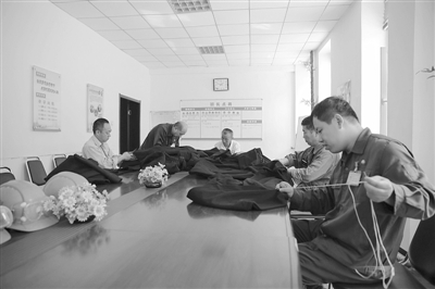 7月20日,在吉林石化公司化肥厂硝酸车间交接班室内,一群男员工正手持针线干着缝补活。“先大针码拱上,然后再窝边细缝。这活做得还真像那么回事儿!”这些粗手大脚的男人做的针线活,受到女工啧啧称赞。