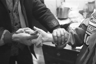 洛阳市老城区丽景门广场,有个修鞋摊,修鞋车上,一个身着蓝白外套的男孩正蜷缩在里面读书。“航航10个月大时,他妈嫌家里穷,悄悄走了。”杜建伟说,他是孟津县人,因小儿麻痹症腿脚落下了残疾,10多年前来到洛阳修鞋,航航是跟他在修鞋摊长大的。杜建伟说,航航现在读三年级,他希望航航能多读书,这个不识字的男人坚信“孩子读书才能有出息”。图为回家后,父亲给航航擦手,准备吃晚饭。张琮/CFP