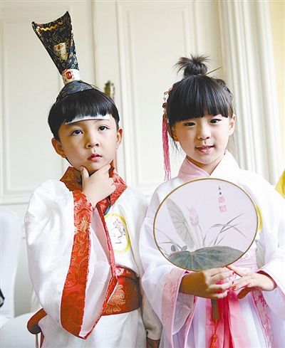 赛场上,孩子们展示诗文朗诵、成语演说、国韵走秀、缤纷国艺、读画猜诗、童蒙礼仪,小选手们用纯真稚嫩的童声把国学串成一曲曲时代的经典。《唐诗三百首》、《论语》、《离骚》等国学经典信手拈来,童声稚嫩,却抑扬顿挫,铿锵有力。国韵走秀和国艺表演更是让在座的评委们拍手叫好。 成果/CFP