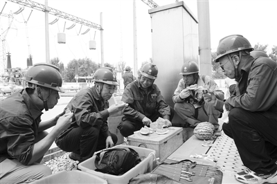 图为变电检修人员在220千伏胜利变电站#2主变检修现场吃西瓜避暑降温。(任海涛)