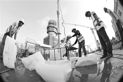 日前,在全国民航第一高空管塔台——高115米的武汉天河机场T3航站楼空管塔台施工工地,中建三局基础设施工程公司将冰块吊装至施工楼层,为施工一线工人降温。