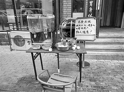 面馆门外摆放着冷饮机,向路人免费提供凉饮。 柳姗姗 摄