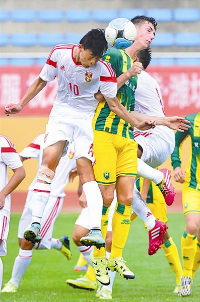7月27日,国青选拔队球员刘若钒(左)在比赛中争顶。