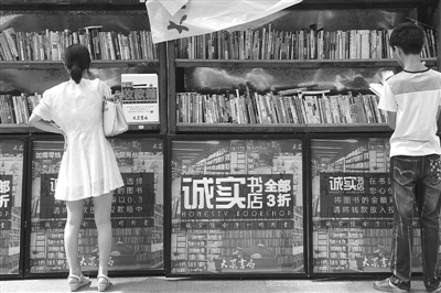 7月27日,南京新街口大众书局门前广场上,无人看管的“诚实书店” 引来过往路人看书购书。据了解,读者在选好图书后,自行将书上的定价乘以0.3,然后将相应的购书款投入收款箱即可。这种没有店员值守,自己投币的售书方式令人颇感新鲜。王路宪/CFP