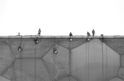 7月27日,北京,蜘蛛人高空作业清洗水立方外立面。