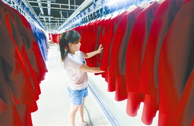 7月30日,河北省永清县台湾工业新城盈珂服饰公司的工人在后整车间整理衣服。