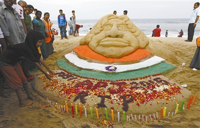 当地时间2015年7月28日,印度钦奈,印度前总统卡拉姆逝世,民众在沙滩制作沙雕悼念。东方IC供图