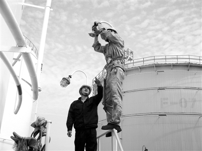 图为该化工园区维修人员根据班组整改意见表正在更换生产库区防爆灯,以利夜间生产作业。 应红枫 摄