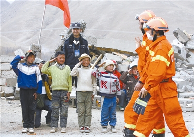 2010年4月18日,玉树地震灾区结古镇,灾区的小朋友向经过的救援部队敬礼。本报记者 杨登峰 摄