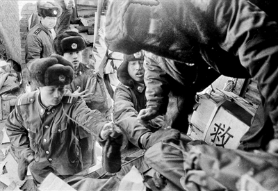 1998年1月10日,河北省张北地区发生6.2级地震。张北、尚义、康保、万全四县10多万间房屋倒塌,4.4万人无家可归。 解放军战士迅速送来了救灾物资。本报记者 许之丰 摄