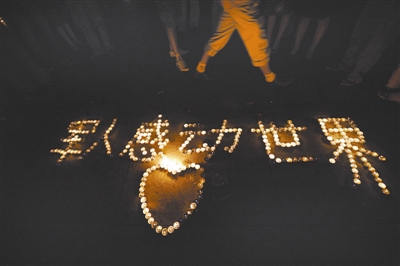 2008年5月20日夜,成都天府广场,市民用烛光排成了“军人感动世界”的字形。本报记者 于文国 摄