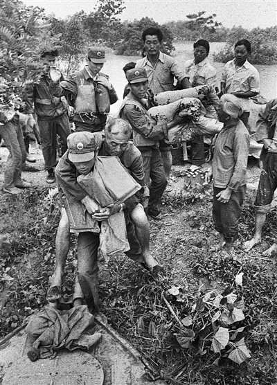 1991年6月16日,我国淮河流域发生特大洪涝灾害后,解放军某部深入安徽滁州乡村挨家挨户排查灾情,这是一位因洪水围困断水断粮的老人被救出的情景。本报记者 于文国 摄