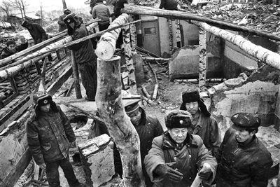 1998年1月11日,解放军战士冒着零下24摄氏度严寒为张北地震中的受灾群众抢建房屋。本报记者 于文国 摄