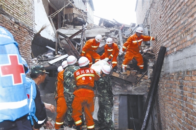 2013年4月23日,四川雅安芦山7.0级地震发生72小时后,在芦山县城,消防战士冒雨从废墟中救出一名疑似有生命体征的受灾群众,并迅速送往医院。本报记者 杨登峰 摄