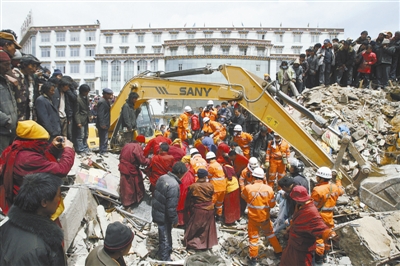 2010年4月16日,玉树地震救援现场,借助挖掘机,部队官兵和藏族民众齐心协力参与救援。本报记者 杨登峰 摄