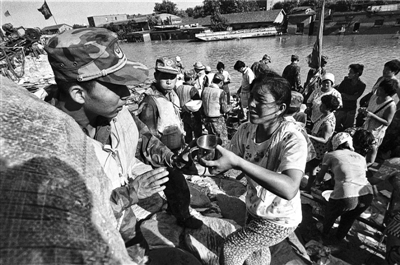 1998年8月12日,九江市6位市民步行20多公里,来到九江长江大堤的溃口处,为战士们送来防暑降温的绿豆汤。本报记者 于文国 摄
