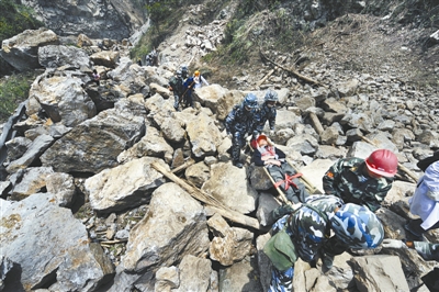 2008年5月18日,海军陆战队的战士们冒着汶川特大地震后随时有山体滑坡的危险,从距离汉旺镇50多公里外清平乡的深山里救出受伤的群众。本报记者 于文国 摄