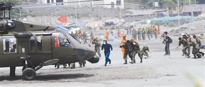 2008年5月15日上午,在汶川特大地震震中映秀镇,首批抵达的军用直升机转移受灾重伤员。本报记者 于文国 摄