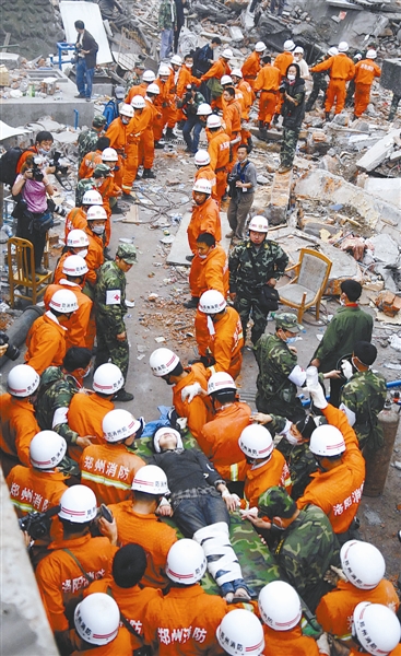 2008年5月17日18时,汶川地震灾区什邡市蓥华镇,在废墟中被埋了多个小时的女工卞钢芬被消防战士救出。本报记者 许之丰 摄